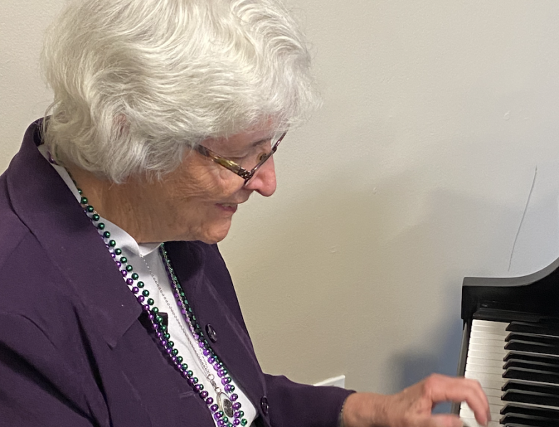 A line of Sisters in wheelchairs, with walkers, and independent walkers began moving and weaving to the jazz that was announcing: “Laissez les bon temps rouler!”